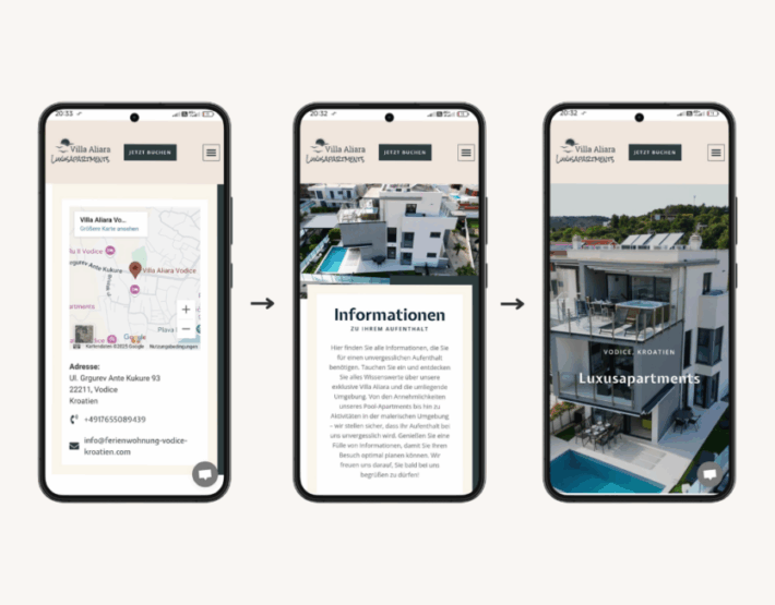 Die Website für die Villa Aliara wurde entwickelt, um potenziellen Gästen eine benutzerfreundliche Plattform zur Verfügung zu stellen, auf der sie detaillierte Informationen über die luxuriösen Apartments in Vodice, Kroatien, erhalten und Buchungen vornehmen können. Die Villa bietet zwei separate Luxus-Apartments: eines mit eigenem Pool und das andere mit Jacuzzi.